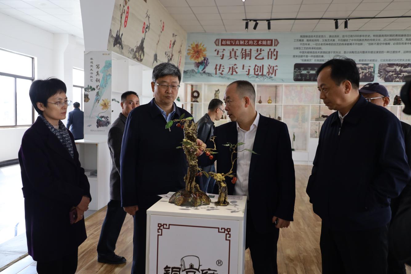 公司創(chuàng)始人趙敏陪同孫勇副省長(zhǎng)深入生產(chǎn)車間和銅藝產(chǎn)品展示廳,認(rèn)真調(diào)研設(shè)計(jì)、加工、展示等環(huán)節(jié),趙敏介紹了銅官府生產(chǎn)經(jīng)營(yíng)、銅藝產(chǎn)品出口、銅建筑裝飾開(kāi)發(fā)利用、非遺技藝傳承和創(chuàng)新情況,并就公司在銅官品牌和銅文化的打造以及創(chuàng)新商業(yè)模式等方面的工作進(jìn)行了匯報(bào)。
